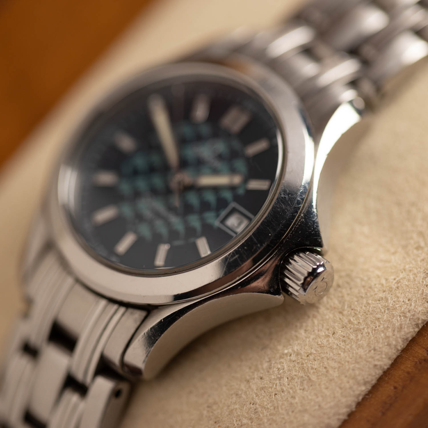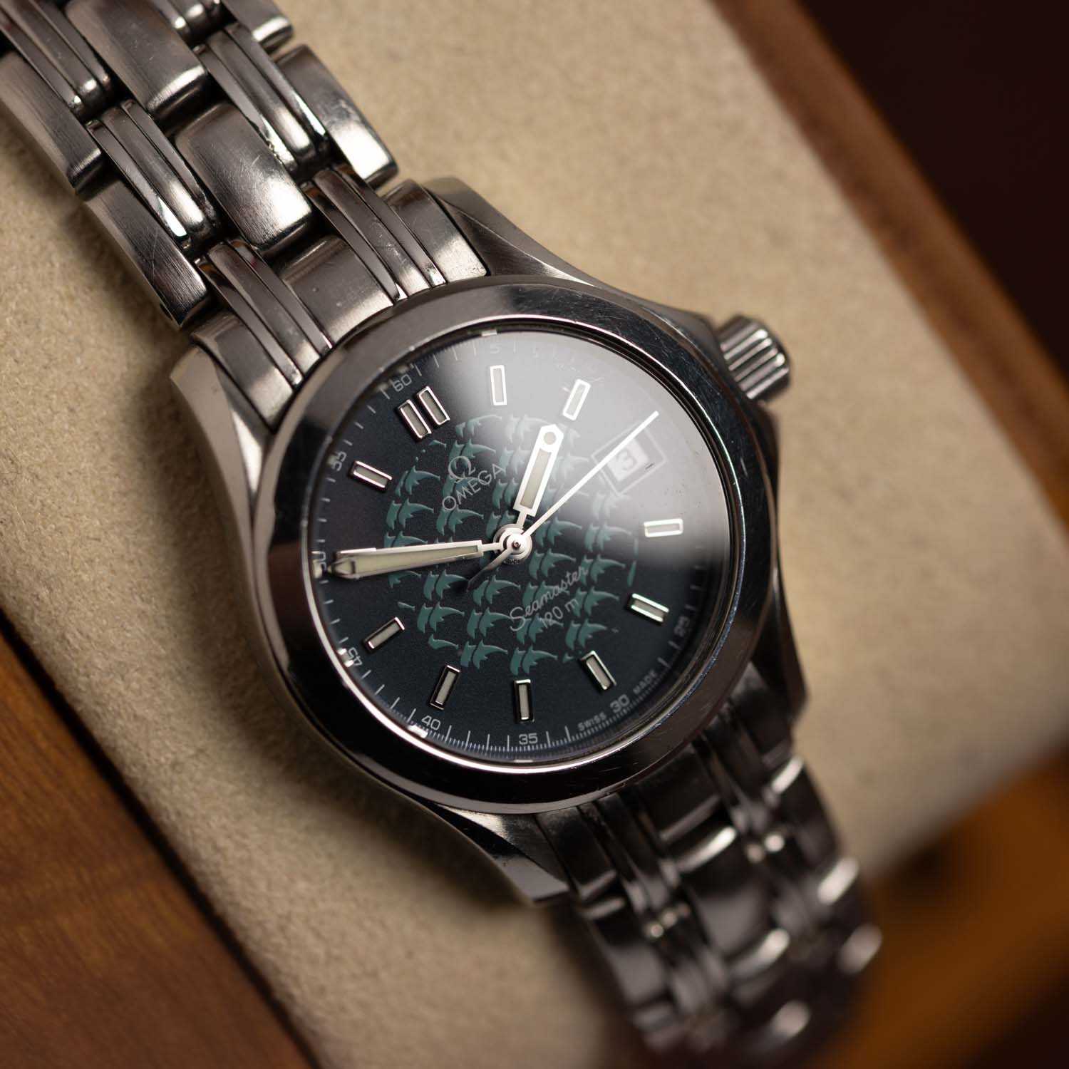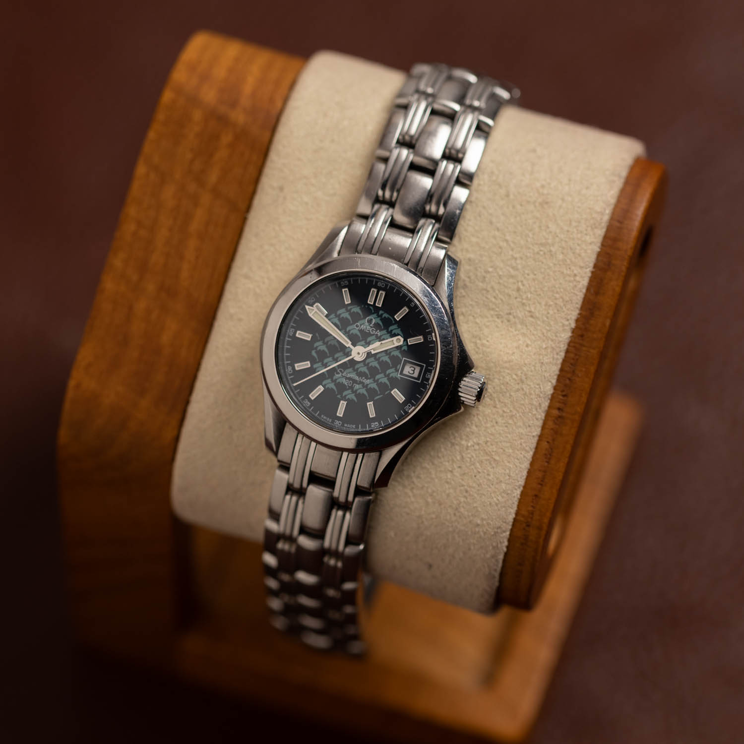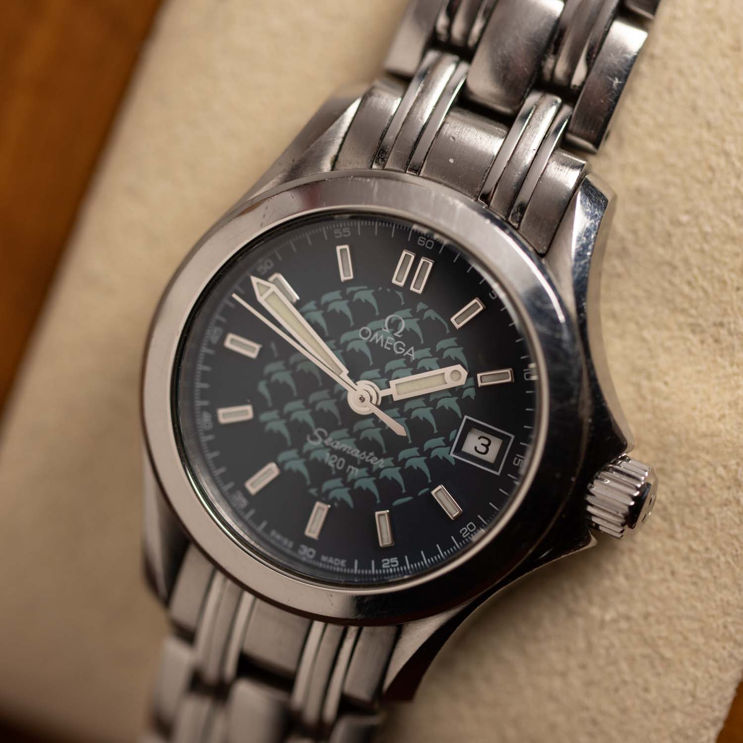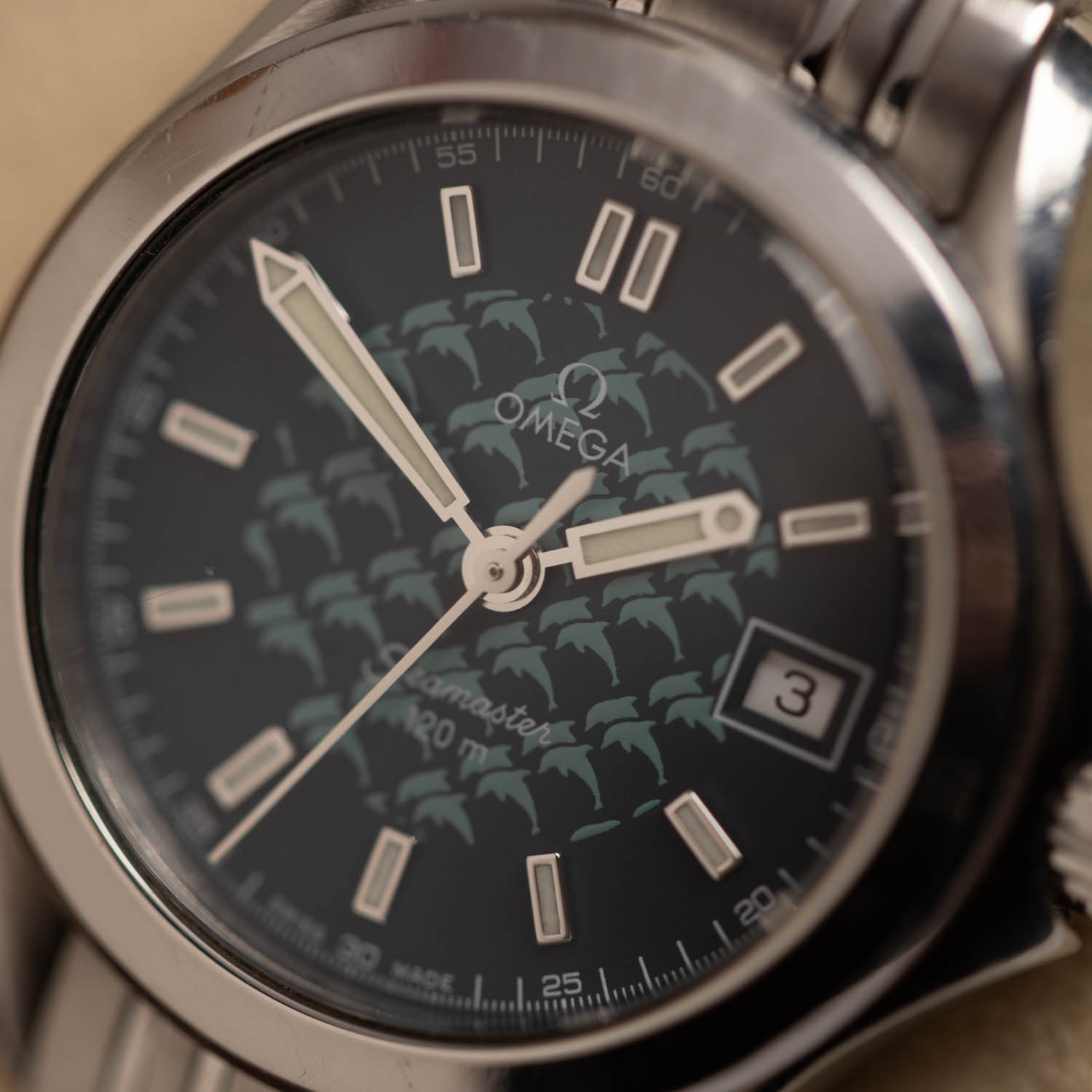 Characteristic dolphins on the watch dial